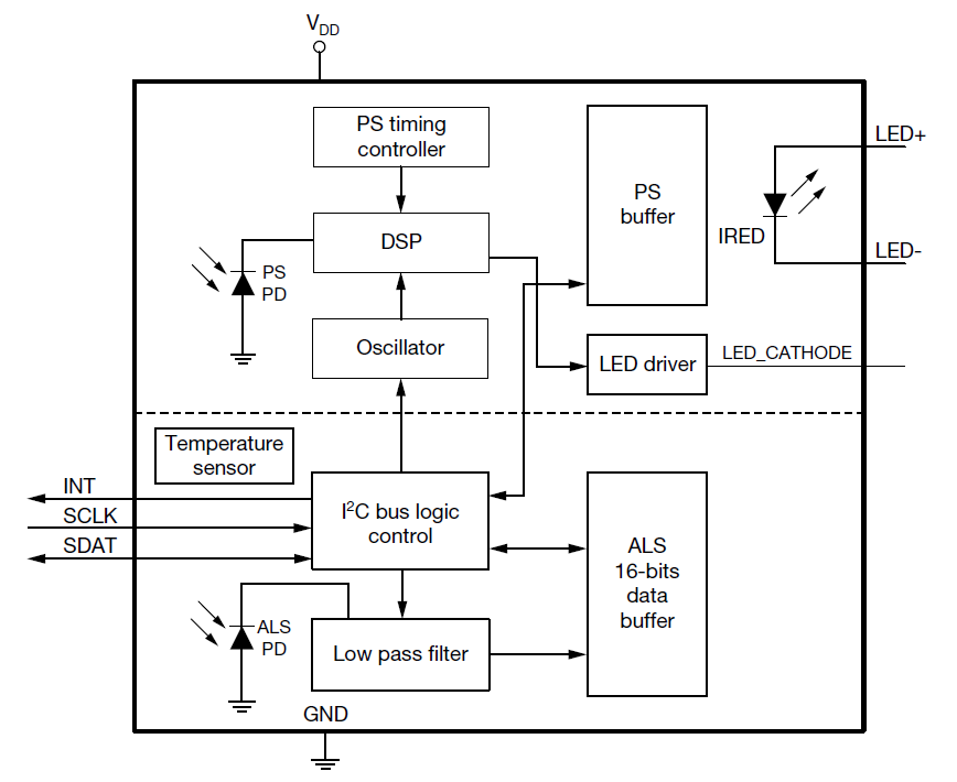 集成模块:红外发射器 (IRED),环境光传感器 (ALS),近传感器 (PS),信号调理IC