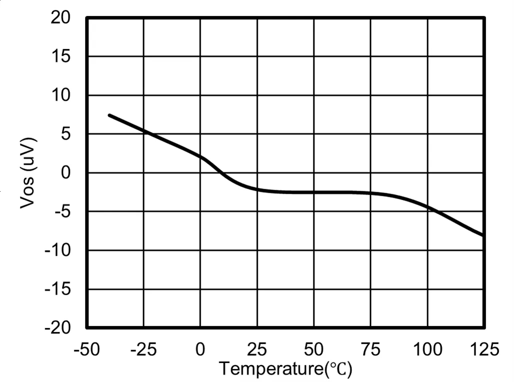 TPA178x系列提供卓越的直流精度和交流性能,可以运行在高达36V 的供电电源,并实现轨到轨输入和输出,具有超低失调电压、失调电压漂移以及10MHz带宽和高容性负载驱动,这些特性使TPA178x成为一个适用于高压工业应用的强大的高性能运算放大器。其独有的双温Trim技术,使得Vos及温漂远优于普通运放,同时没有斩波噪声,其Vos的典型温漂曲线如下图: