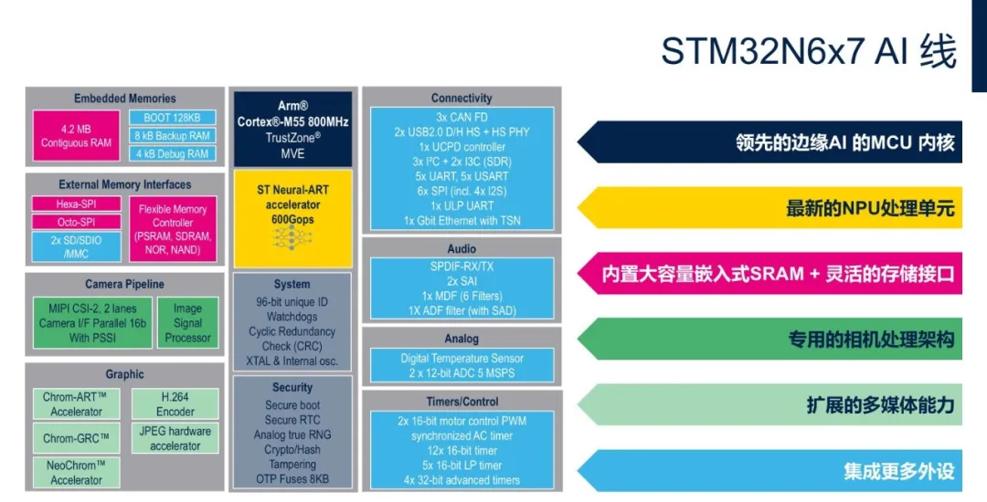以用于AR+AI智能眼镜的STM32N6为例,采用Cortex-M55内核,主频800MHz,多任务处理能力显著增强;搭载ST自研Neoral-ART NPU单元及ISP单元,适配视觉识别类边缘AI任务;同时内置Chrom-ART、Chrom-GRC、NeoChrom多钟图形加速器,可处理图形渲染等任务,有效降低CPU负载;如上图,STM32N6还集成多种外设及多媒体能力,既能满足数据采集、外设控制等需求,也能驱动图形界面,为GUI开发提供硬件级支持。