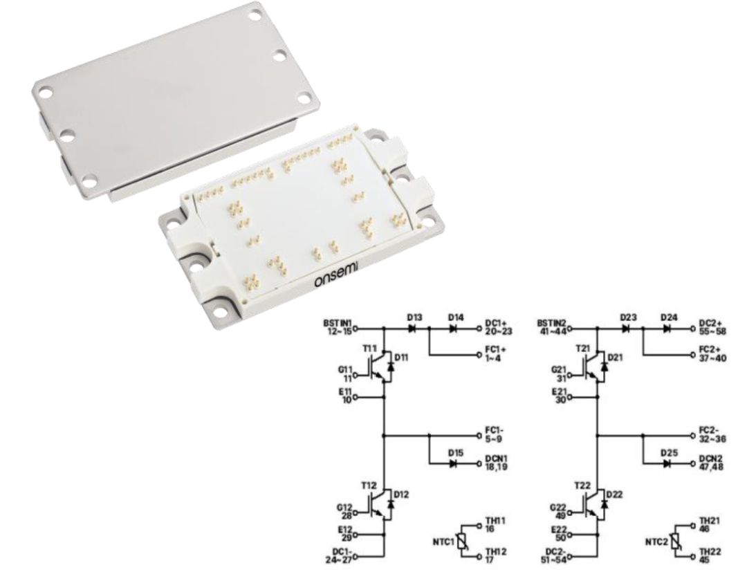 双通道飞跨电容升压模块, 每路通道包含两颗 1000 V、500 A 的 IGBT 和两颗 1200 V、 120 A 的碳化硅 (SiC)二极管。 F5BP PIM 封装具备出众的散热性能, 相较F5-PIM 封装, 热阻降低 9% , 可支持 1500 VDC 系统,是公用事业级应用的理想选择。