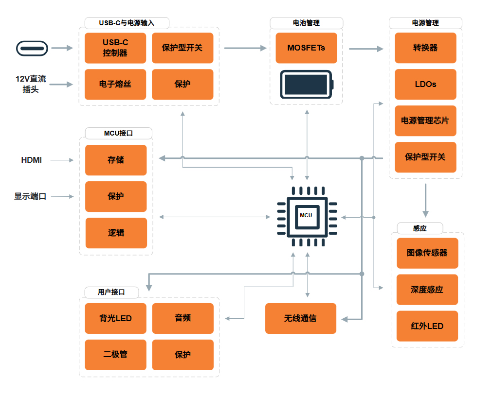 下图展示了由安森美(onsemi)推荐的增强现实与虚拟现实(AR/VR) 头戴设备应用方案。 大部分功能块都可采用安森美的器件/方案, 详见所附器件表。 该图提供了典型的AR/VR头戴设备系统示意性概述, 并集成了图像传感器、电源管理IC和连接模块等关键技术, 以实现身临其境且响应迅速的用户体验。