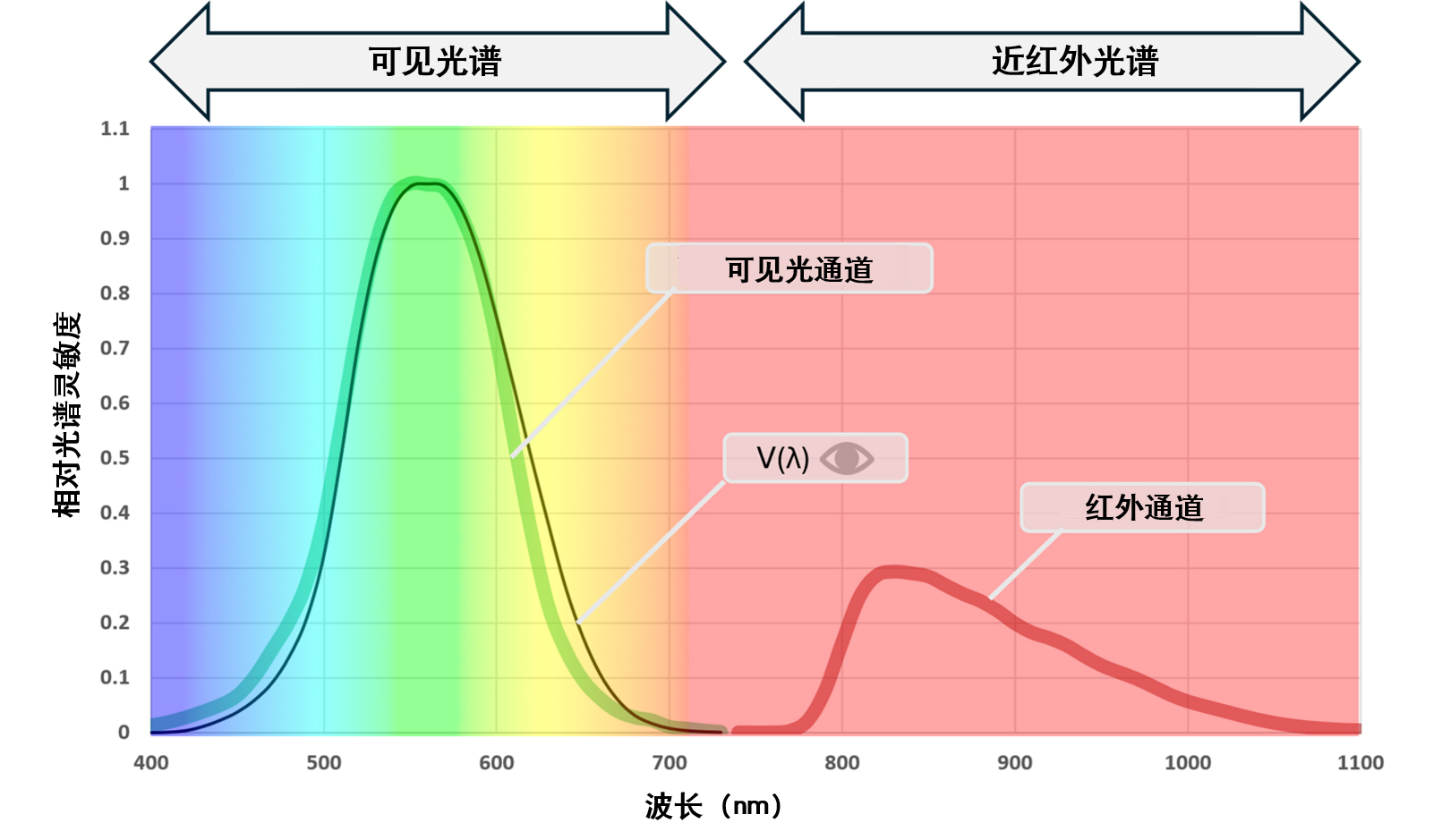 由于许多光源还包含不可见红外光谱的波长,环境光传感器会增设一个额外的红外通道。该通道通常与 ALS 通道配合使用,以提升不同光源亮度的测量精度。
