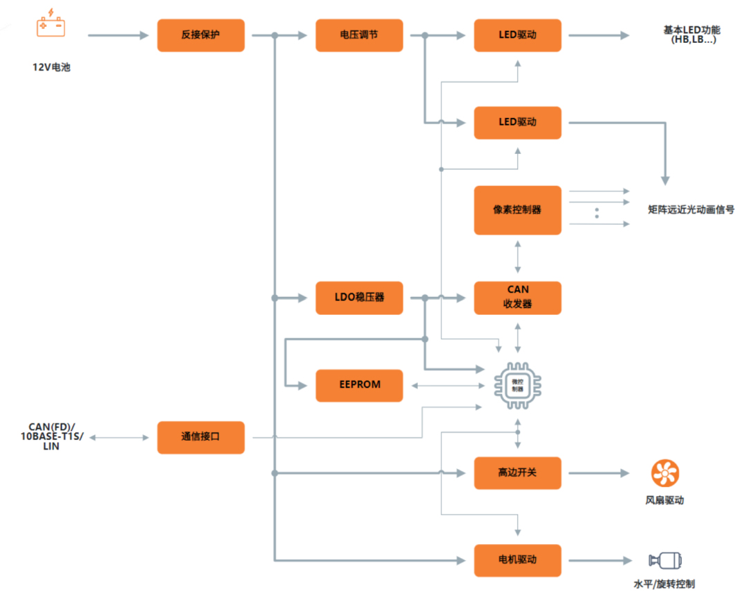 聚焦汽车先进前照灯领域,安森美给出了一套解决方案,其核心架构可通过以下框图直观了解。该方案兼具基本LED 照明功能与热门矩阵灯功能,除了由 LED 驱动器控制的主要功能外,安森美还提供用于低压电源转换、风扇控制、大灯水平调节与旋转控制、CAN 和 LIN 收发器等多种关键元件。