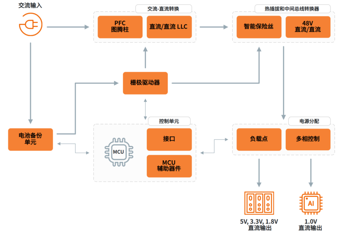 该框图详细说明了AI数据中心采用的ACDC转换与DC-DC配电级。 安森美通过整合尖端技术实现协同效应,方案融合了先进的硅基(Si)、碳化硅(SiC)和氮化镓(GaN)功率开关技术, 同时集成栅极驱动器、多相控制器及48V控制器、智能功率级(SPS)模块、智能熔丝以及负载点(PoL)降压转换器等多种元器件。 该组合方案可显著提升系统能效与功率密度, 从而大幅缩减系统尺寸。