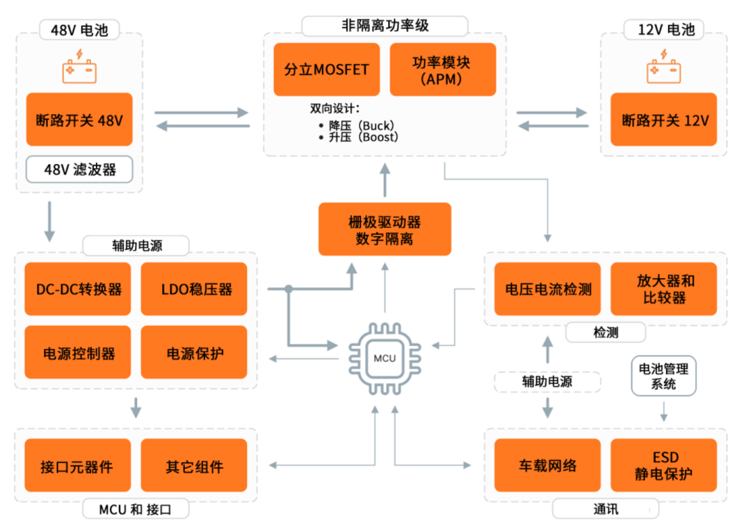 启动 / 发电一体机(BSG、ISG)的主驱驱动装置,与其他电动汽车(BEV、PHEV)的逆变器结构高度相似,核心区别在于其工作电压为 48V。