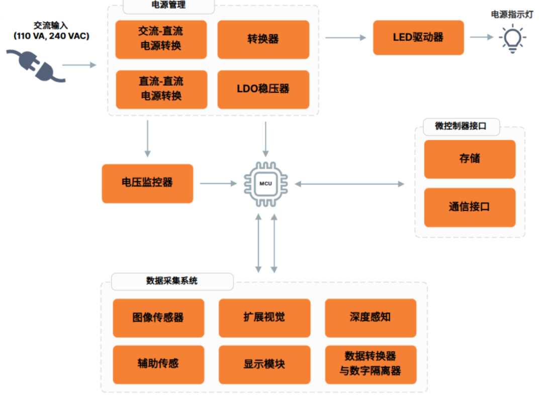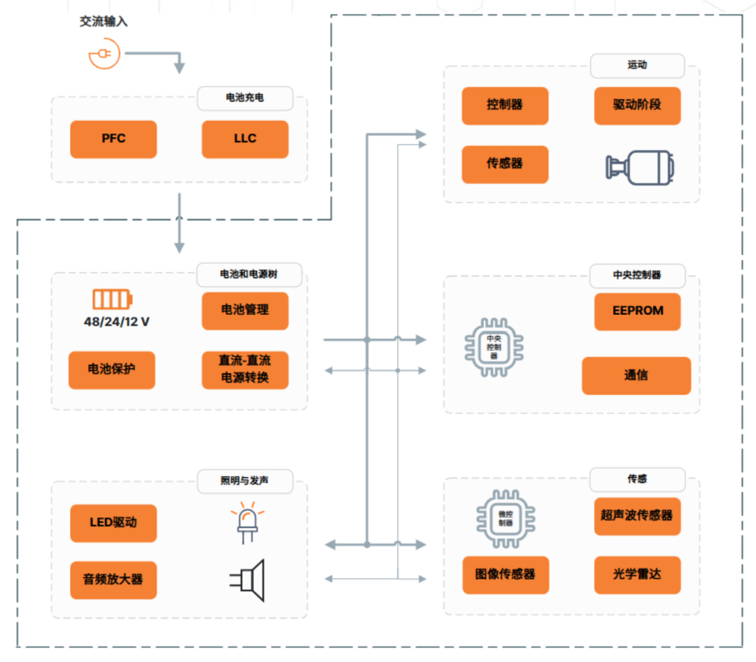 安森美为智能移动机器人打造了一整套解决方案,其系统架构可通过下框图清晰查看。机器人系统由多个相互连接的子模块构成, 主要包括电池管理、 运动控制、 感测和中央处理器 (CPU) 等子模块。 这些子模块方案与具体的应用场景紧密相关:例如,仅在内部作业的机器人所需的传感器数量较少;而搭载机械臂的机器人则需要配备更多电机逆变器。