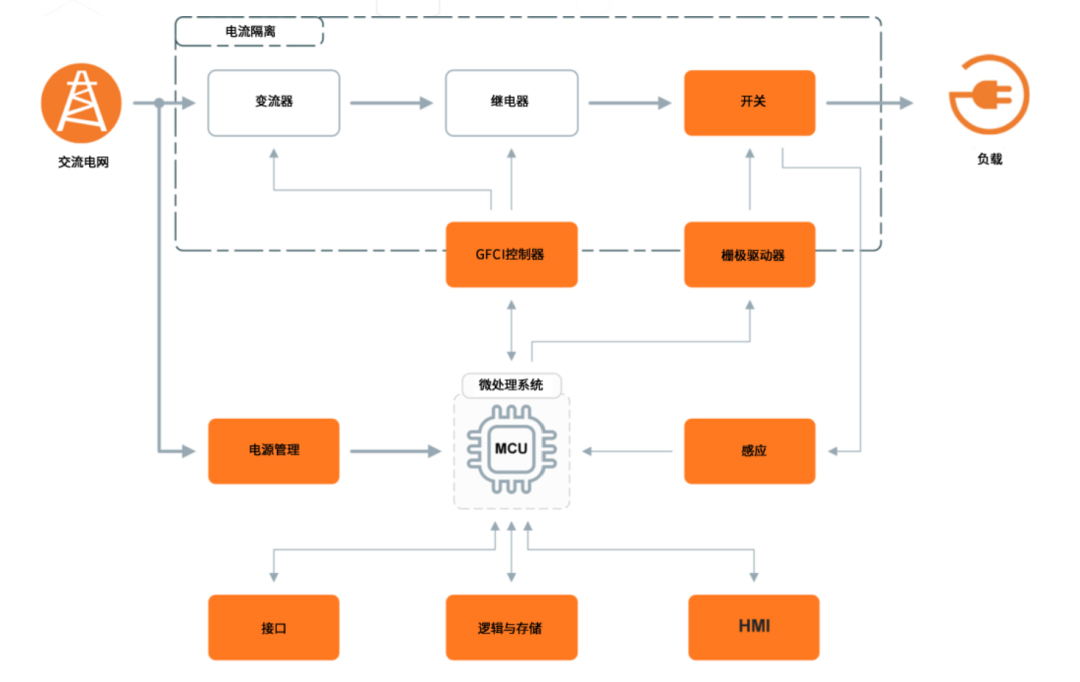 下图展示了一种采用安森美推荐产品的固态断路器解决方案框图。 其中最关键的组成部分是取代传统电磁继电器的开关。 栅极驱动器用于控制开关, 接口模块则实现器件间的通信。 另一核心部分是检测模块, 包含电流检测与温度检测功能。 为增强系统性能, 可集成接地故障断路器(GFCI) 。