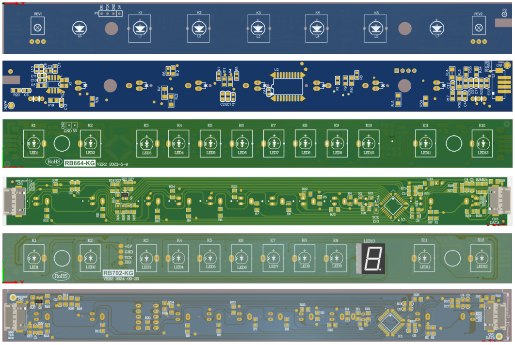 采用电源板+显示板的方案,显示板负责功能逻辑控制,还包括触摸按键,数码管和LED等外设控制,根据烟机版本的不同,还会加入红外手势控制,激光热感模块等外设。