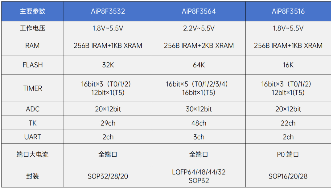中微爱芯AiP8F35XX电路均可用于显示板方案,具体参数如下表所示: