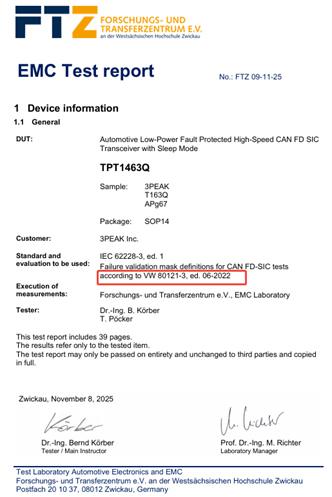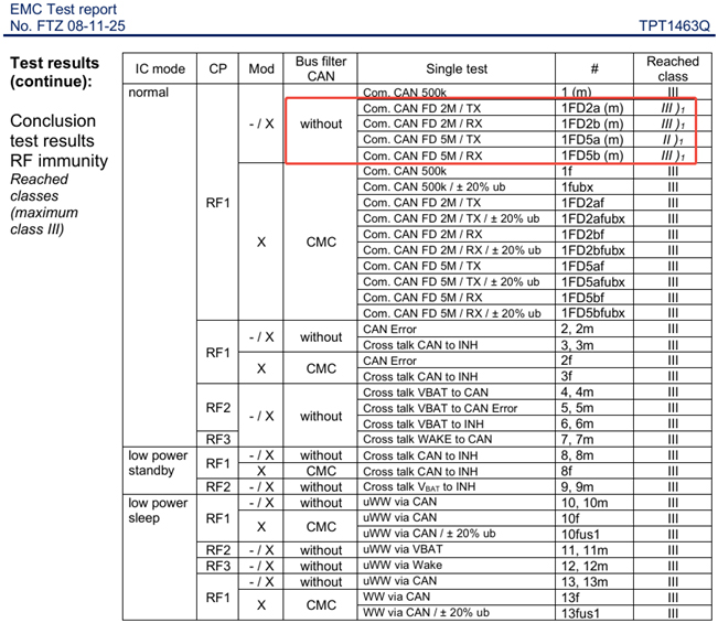 随着汽车智能化、电动化升级,整车电子模块数量激增,电磁环境愈发复杂,对核心器件的EMC性能要求更为严苛。思瑞浦TPT1463Q凭借卓越的芯片设计,不仅通过了IEC62228-3各项标准规范,更通过了大众集团VW80121-3,2023-12对CAN FD-SIC标准要求,实现无特殊条件备注下全测试向量通过Class-3最高等级。涵盖四大核心测试维度,全面覆盖车载场景电磁干扰风险,在抗干扰功率、瞬态防护等关键指标上设置更高阈值,充分验证芯片在复杂车载环境中的稳定性。