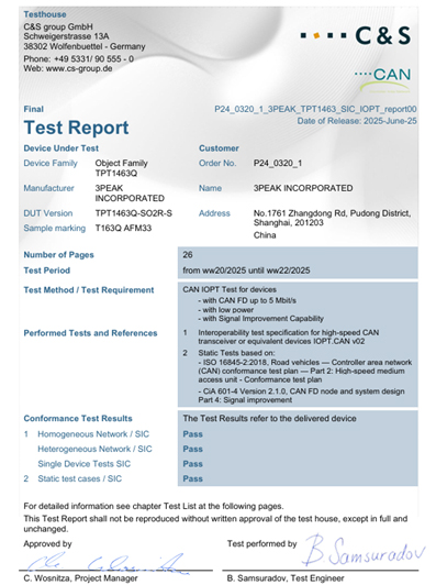 TPT1463Q通过C&S互联互通一致性与兼容性测试(IOPT 测试),在2M/5Mbps不同速率下的复杂组网异构场景中,展现出与国际竞品的良好通信能力,具备与整车CAN总线上下游设备的无缝对接能力,可与其他C&S认证CAN收发器无障碍通信,无需车企投入大量资源进行整车兼容性测试,缩短车型研发周期。