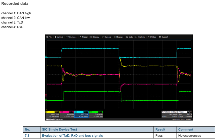 此外,C&S参考CiA 601-4专项测试规范,搭建特定振铃网络模拟复杂车载信号干扰场景,重点考察接收端表现。TPT1463Q依托出色的SIC振铃抑制电路设计,有效抑制信号振铃,保障干扰环境下数据可靠通信,充分验证了其在复杂车载通信场景的稳定性与兼容性。