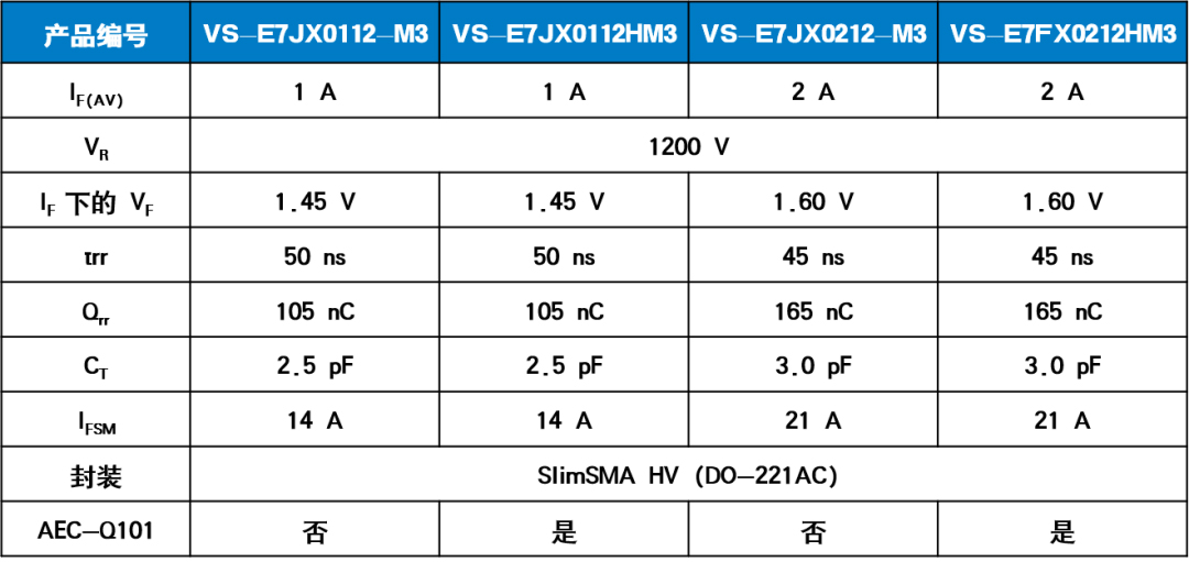 VS-E7JX0112-M3、VS-E7JX0112HM3、VS-E7JX0212-M3 和 VS-E7JX0212HM3 可用作反激辅助电源的钳位、缓冲和续流二极管,也可用作自举驱动器功能的高频整流器,同时可为最新快速开关 IGBT 和高压 Si / SiC MOSFET 提供去饱和保护。器件的典型应用包括工业驱动器和工具、电动汽车(EV)车载充电器和电机、发电和储能系统,以及 Ćuk 转换器和工业 LED SEPIC 电路。