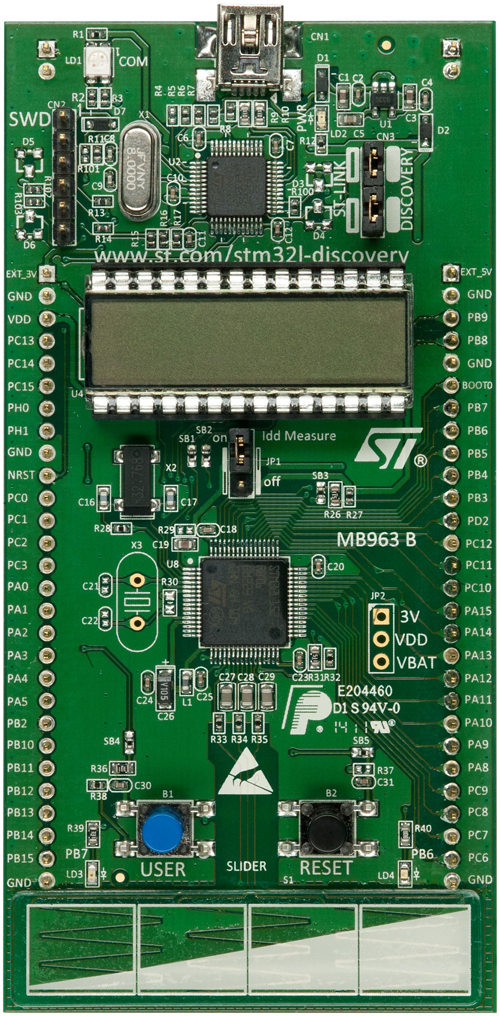 STM32L-DISCOVERY 基于 STM32L152RBT6 的超低功耗最小系统开发板,板上集成了ST-LINK/V2仿真下载器(对外提供SWD接口)、触摸感应按键和