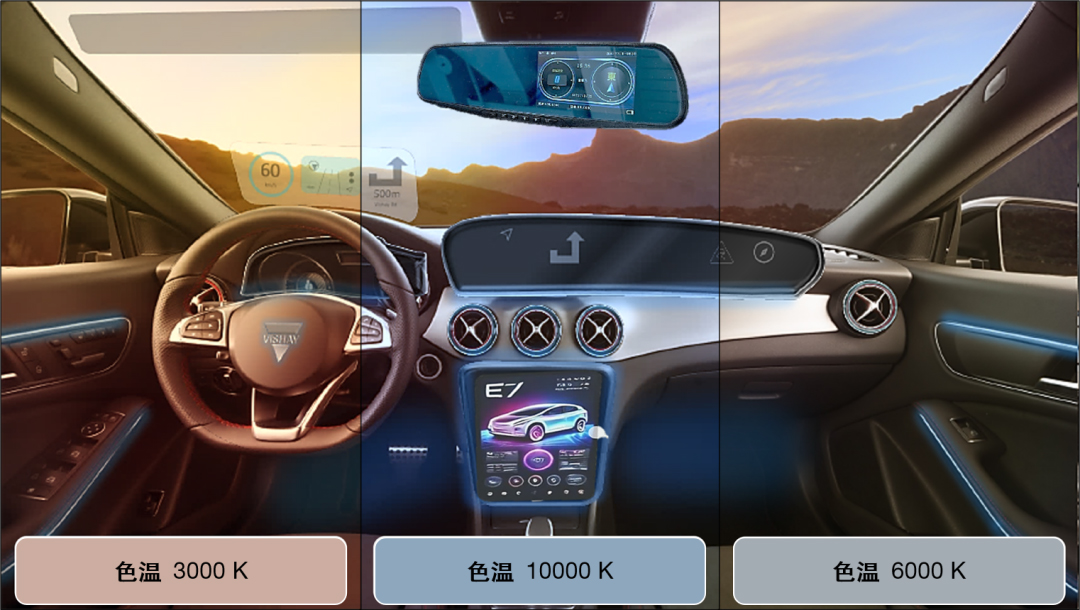 右侧 6000 K 示例表示颜色受控条件下的背光,显示色调根据环境照明的相对色温 (CCT) 相应调整。这样可以确保色觉的一致性和准确性,无论光谱如何,从而保持显示屏的理想可读性和驾驶员舒适性。