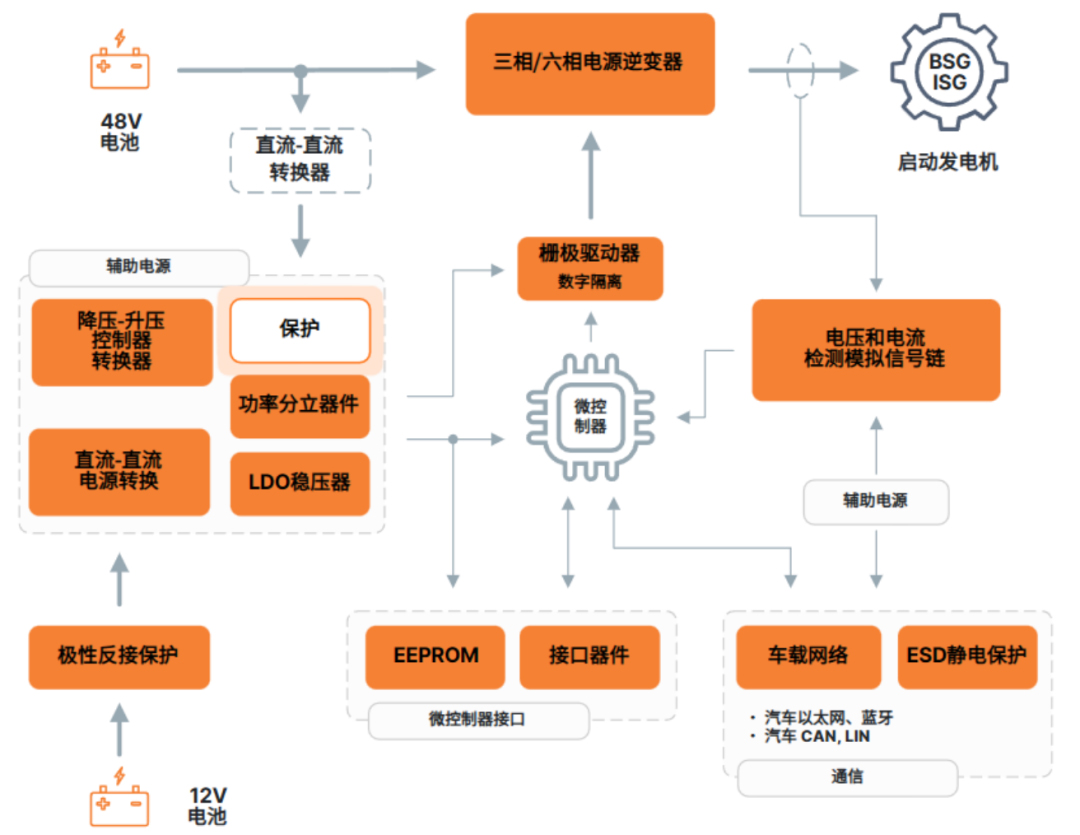 启动 / 发电一体机(BSG、ISG)的主驱驱动装置,与其他电动汽车(BEV、PHEV)的逆变器结构高度相似,核心区别在于其工作电压为 48V。