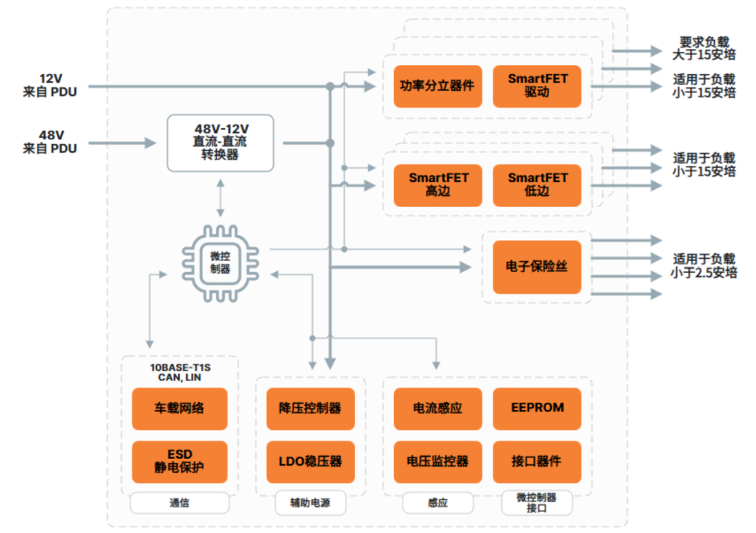 区域控制器 (ZCU) 是车辆区域控制架构中的基本元素,负责管理指定区域内的配电。 它从电源分配单元获取电力,并将电力智能分配给所负责区域内的各种电气系统、 负载和传感器。借助汽车以太网,ZCU 还可充当车辆的数据和网络网关, 通过 100/1000BASE-T1 以太网主干网,与中央计算机进行上游通信。与摄像头、 传感器、 激光雷达等边缘节点的下游通信则建立在 10BASE-T1S 以太网上。 传统的 ECU 仍可通过 CAN、 LIN 等传统总线,保持与ZCU的连接。