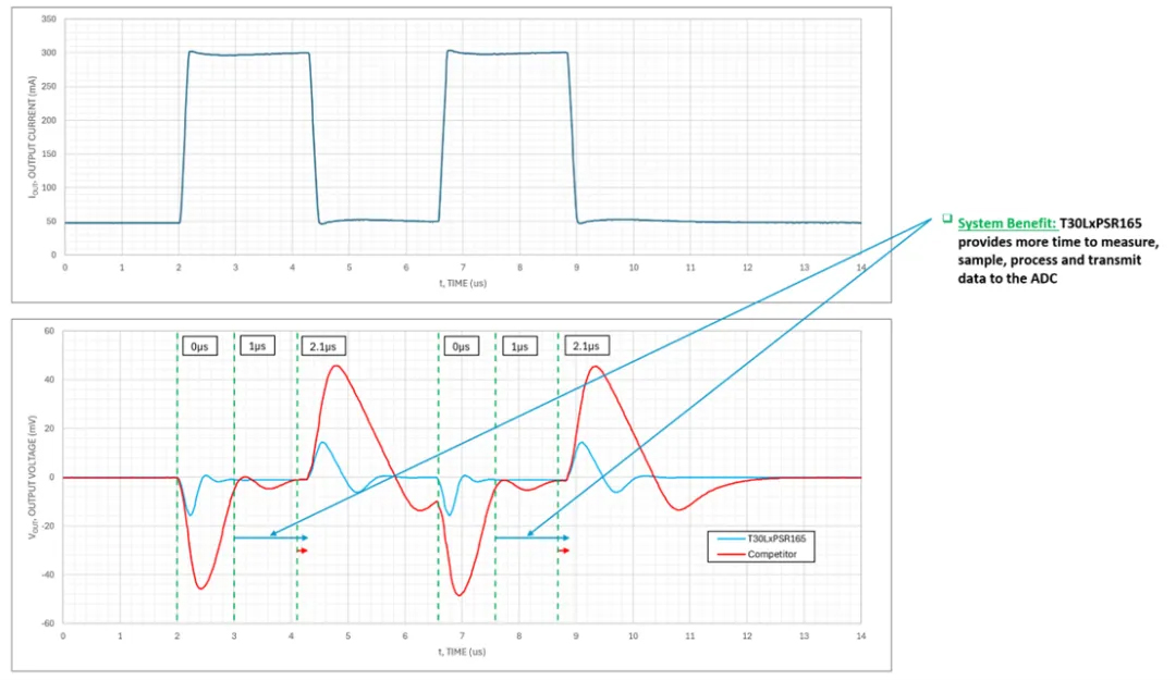 当负载电流突然增大时,LDO 必须迅速调整输出电压,以维持电压稳定。瞬态响应性能不佳会导致电压下冲,进而可能引发处理器故障或复位、数据损坏、性能降级或可靠性下降等问题。