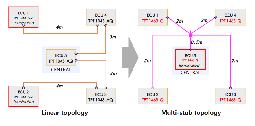 组网更灵活:打破传统CAN FD适用局限,多节点复杂星型组网下仍保持高质量总线电平波形,拓扑设计更灵活。
