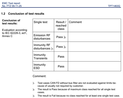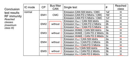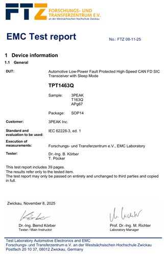 随着汽车智能化、电动化升级,整车电子模块数量激增,电磁环境愈发复杂,对核心器件的EMC性能要求更为严苛。思瑞浦TPT1463Q凭借卓越的芯片设计,不仅通过了IEC62228-3各项标准规范,更通过了大众集团VW80121-3,2023-12对CAN FD-SIC标准要求,实现无特殊条件备注下全测试向量通过Class-3最高等级。涵盖四大核心测试维度,全面覆盖车载场景电磁干扰风险,在抗干扰功率、瞬态防护等关键指标上设置更高阈值,充分验证芯片在复杂车载环境中的稳定性。