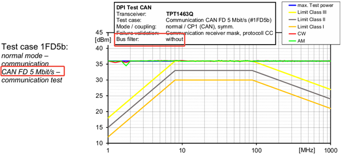 TPT1463Q内置 "差分信号增强单元",兼顾高速通信和高抗扰性能,在2Mbps/5Mbps高速通信场景下,无需依赖行业常规的共模电感即可实现高抗扰性能,在BCI大电流注入测试中,无共模电感情况下在0.1-400MHz全频率范围干扰功率最高200mA,仍能稳定通信,这一性能既保障强干扰环境下高速传输稳定,又节省外围器件成本与PCB空间,降低故障风险,提升系统可靠性。