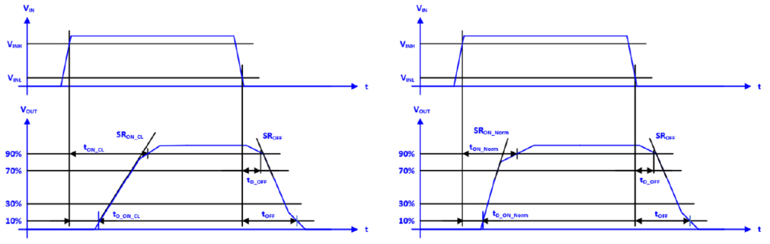 当这种温度梯度差变化达到规定阈值TDTSD时,相对值温度保护功能被激活,从而关闭器件。需要注意的是,在电容性负载模式下,TDTSD阈值会降低至 TDTSD_CL,以限制在给电容性负载充电时器件承受的瞬态应力。此外,热保护将在芯片的差分或绝对热极限被超出时覆盖 I²t 保护。